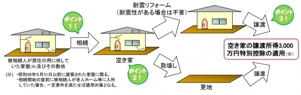 相続または遺贈により取得した被相続人居住用家屋または被相続人居住用家屋の敷地等を、平成28年4月1日から令和5年12月31日までの間に売って、一定の要件に当てはまるときは、譲渡所得の金額から最高3,000万円まで控除することができます。